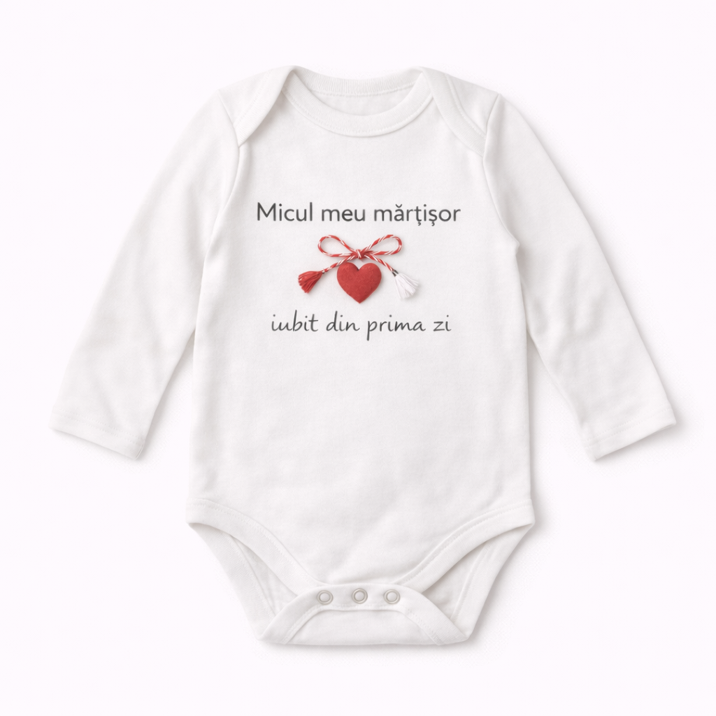 Realizat din material moale si placut la atingere, body-ul este potrivit pentru pielea sensibila a bebelusilor si ofera confort pe tot parcursul zilei. Maneca lunga il face ideal pentru sezonul de primavara, iar detaliul decorativ cu snur de martisor legat in fundita adauga un plus de simbol si rafinament.