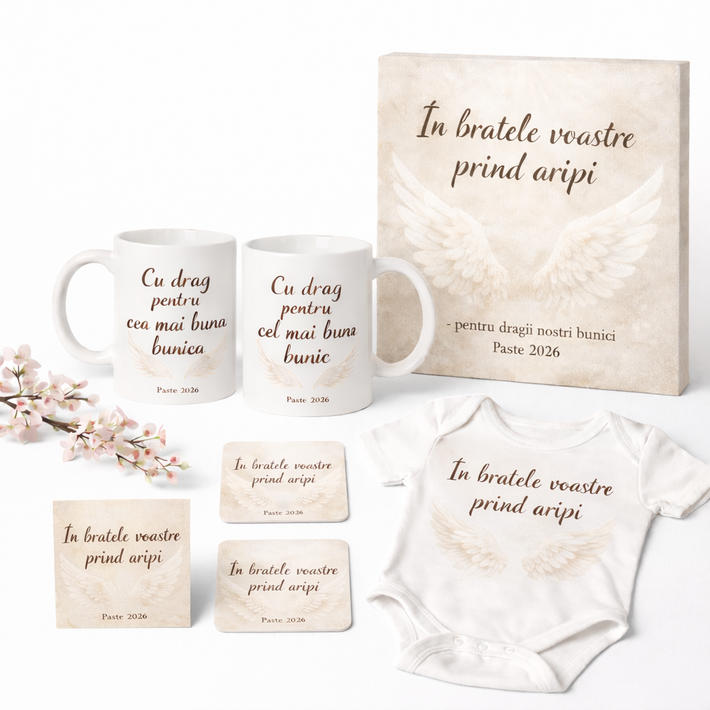 Creat special pentru Paste 2026, setul transmite iubire, respect si apreciere prin mesajul „In bratele voastre prind aripi”. Un dar elegant, unitar si memorabil, gandit pentru a aduce zambete sincere la masa festiva.