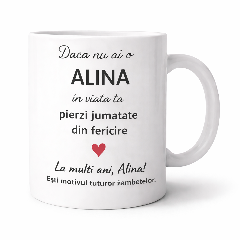 Cana personalizata cu numele Alina este un cadou special, creat pentru a transmite un mesaj frumos si emotionant unei persoane dragi. Designul elegant si mesajul plin de semnificatie transforma aceasta cana intr-un dar memorabil pentru aniversare, zi de nume sau orice moment in care vrei sa surprinzi pe cineva drag.
