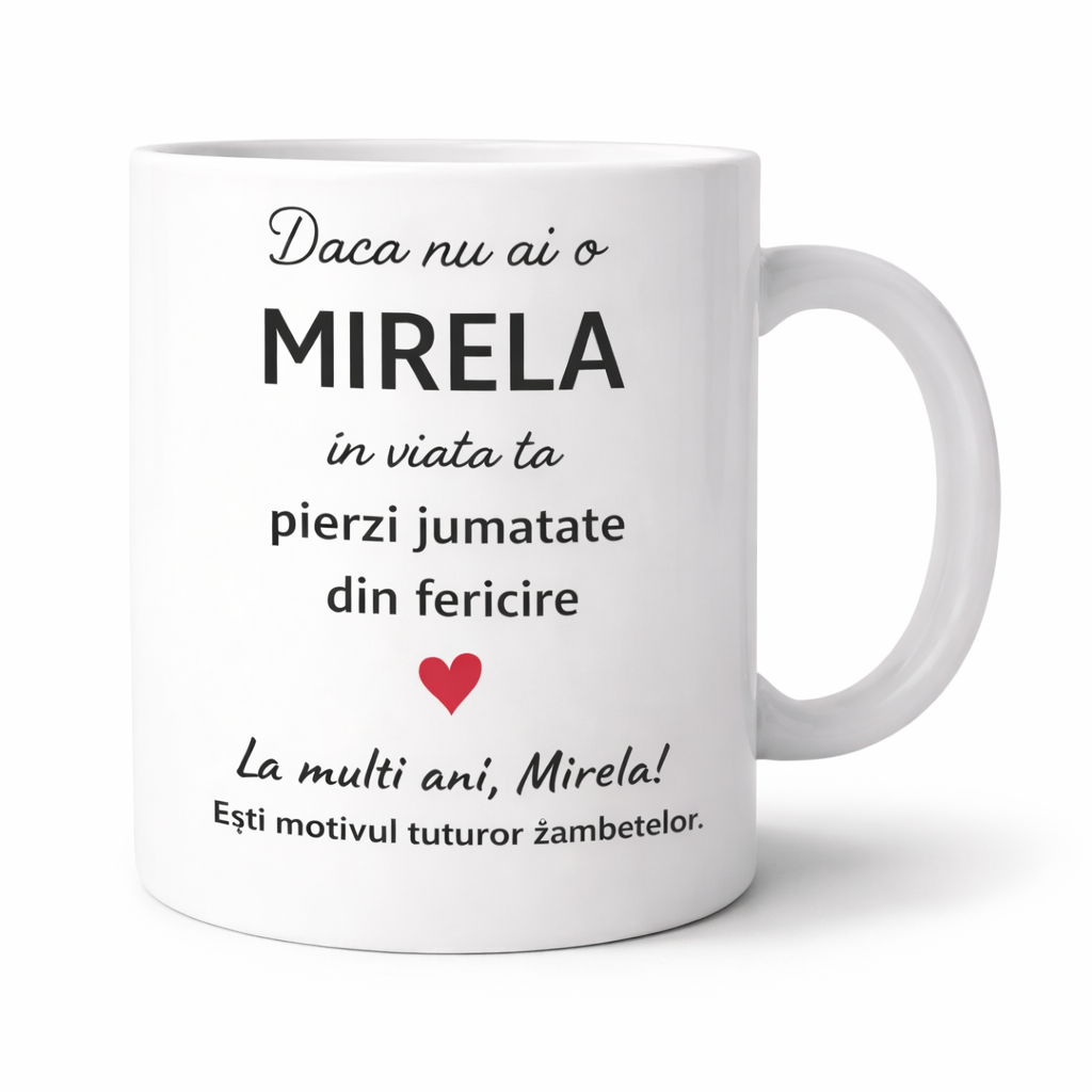 Cana personalizata cu numele Mirela este un cadou special, perfect pentru a transmite un mesaj frumos si emotionant unei persoane dragi. Designul elegant si mesajul plin de semnificatie transforma aceasta cana intr-un dar memorabil pentru aniversare, zi de nume sau orice moment in care vrei sa aduci un zambet pe chipul cuiva.