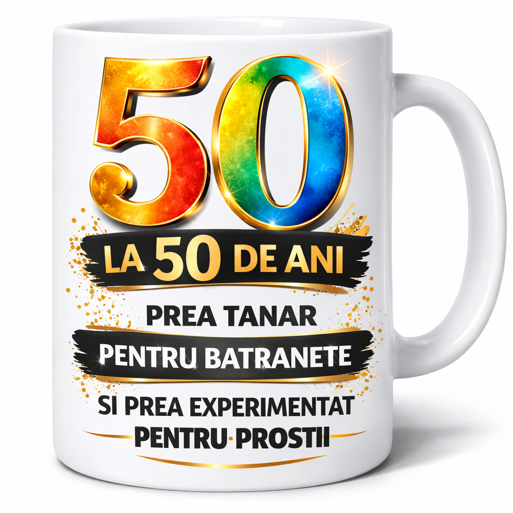 Aceasta cana cu mesaj amuzant este cadoul perfect pentru aniversarea de 50 de ani. Designul modern si colorat cu cifra 50 mare si elemente decorative elegante transforma aceasta cana intr-un cadou memorabil pentru prieteni, colegi sau membri ai familiei.