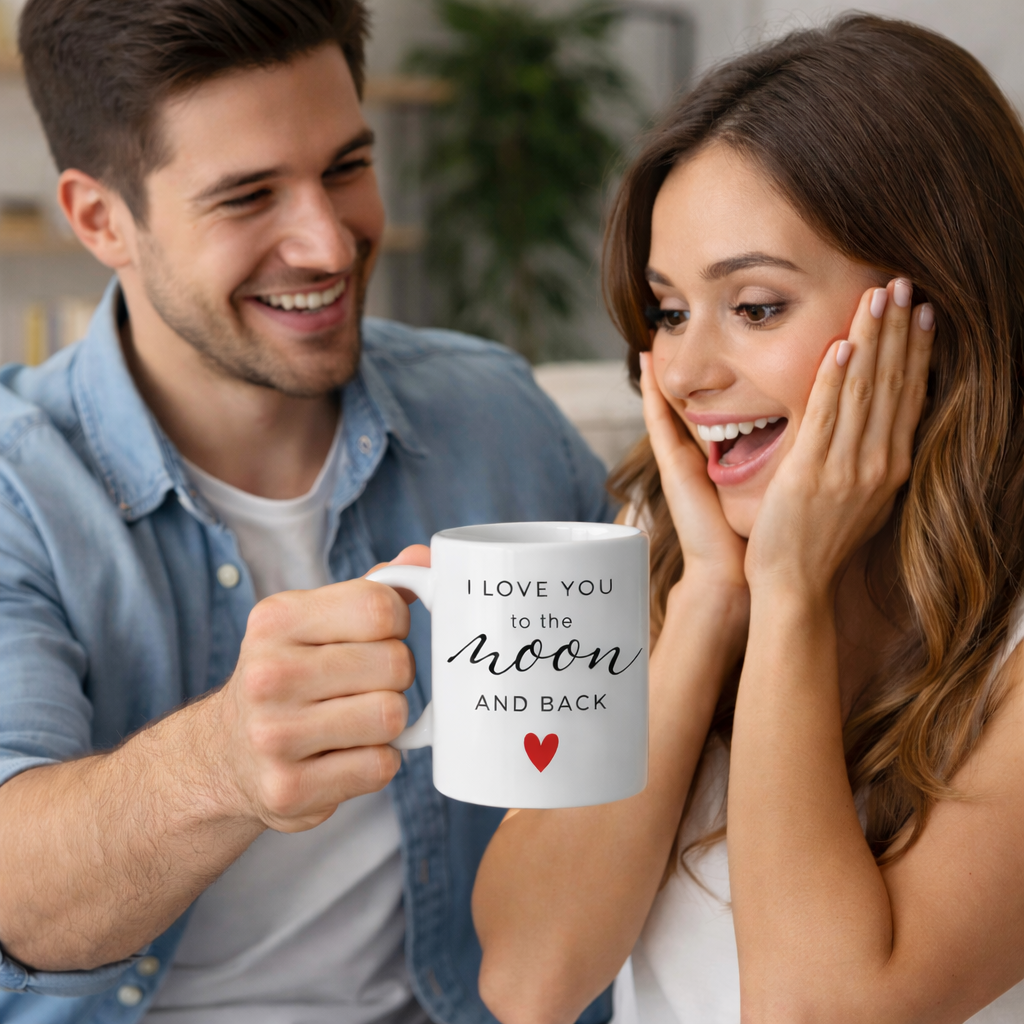 Surprinde persoana iubita cu o cana cadou romantica din ceramica, inscriptionata cu mesajul „I Love You to the Moon and Back”, un simbol al iubirii sincere si profunde. Este alegerea ideala pentru a transforma un gest simplu intr-un moment plin de emotie.