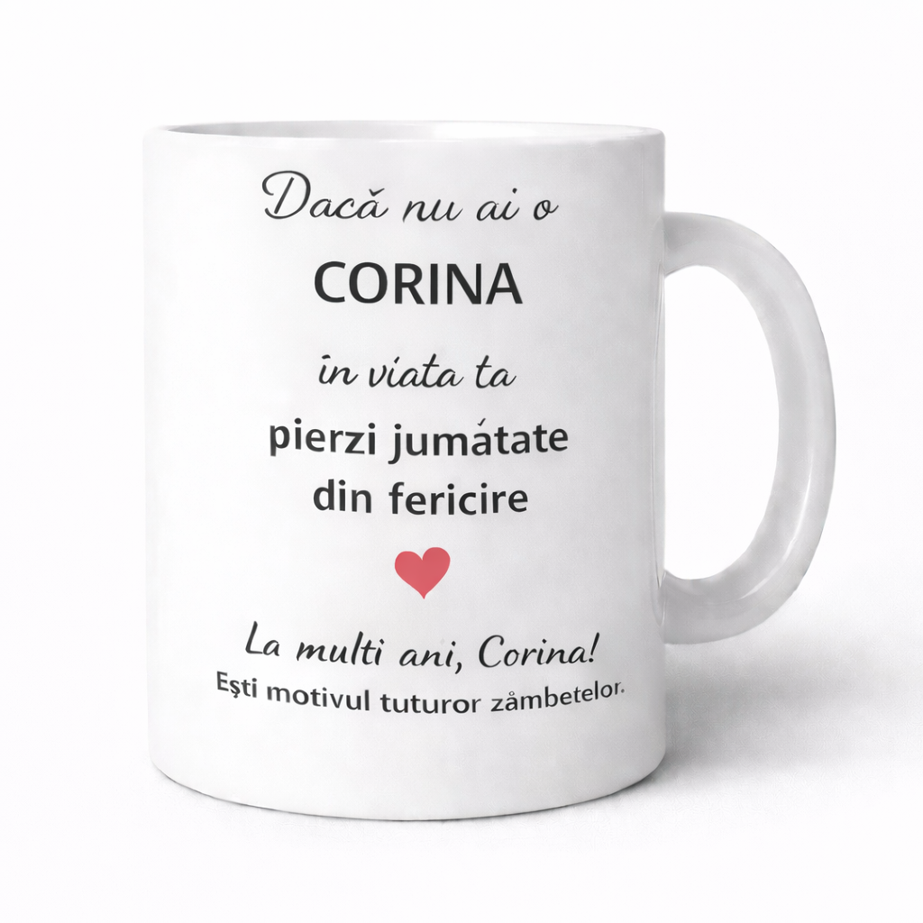 Aceasta cana este ideala pentru a fi oferita cadou unei persoane dragi cu numele Corina, fie ca este vorba despre prietena, sotie, colega sau o persoana importanta din familie.