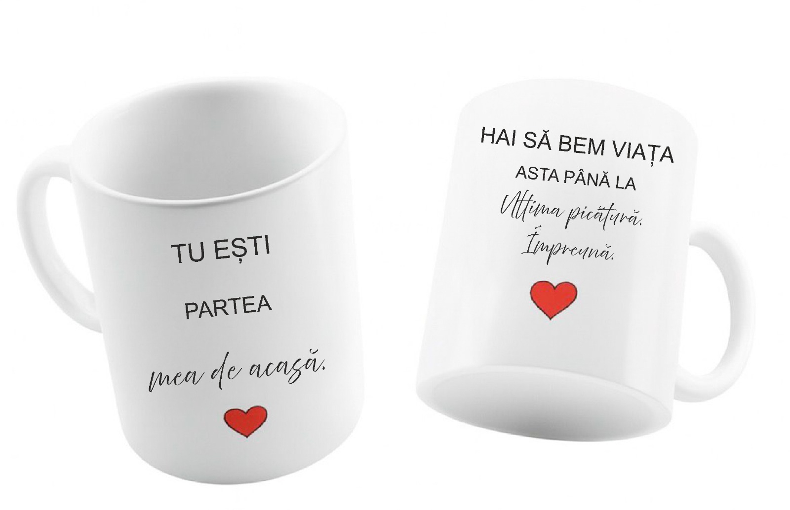Setul de căni „Partea Mea de Acasă” este cadoul care vorbește în locul tău. Două căni albe, curate, cu mesaje calde și delicate, create special pentru cuplurile care știu să transforme diminețile obișnuite în momente împărtășite.