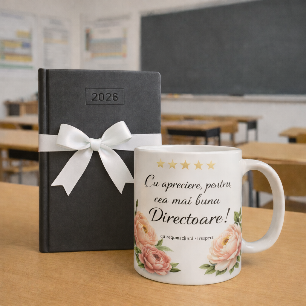 Acest set premium imbina rafinamentul cu aprecierea autentica. Cana personalizata cu bujori delicati si mesajul „Cu apreciere, pentru cea mai buna Directoare!” transmite recunostinta si respect, iar agenda 2026 eleganta completeaza perfect ideea unui dar util si sofisticat.