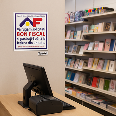 Autocolantul „Vă rugăm solicitați bon fiscal” este un produs obligatoriu pentru orice spațiu comercial din România, conform Legii 64/2002, și are rolul de a informa clienții despre dreptul și obligația de a primi bon fiscal la fiecare achiziție.