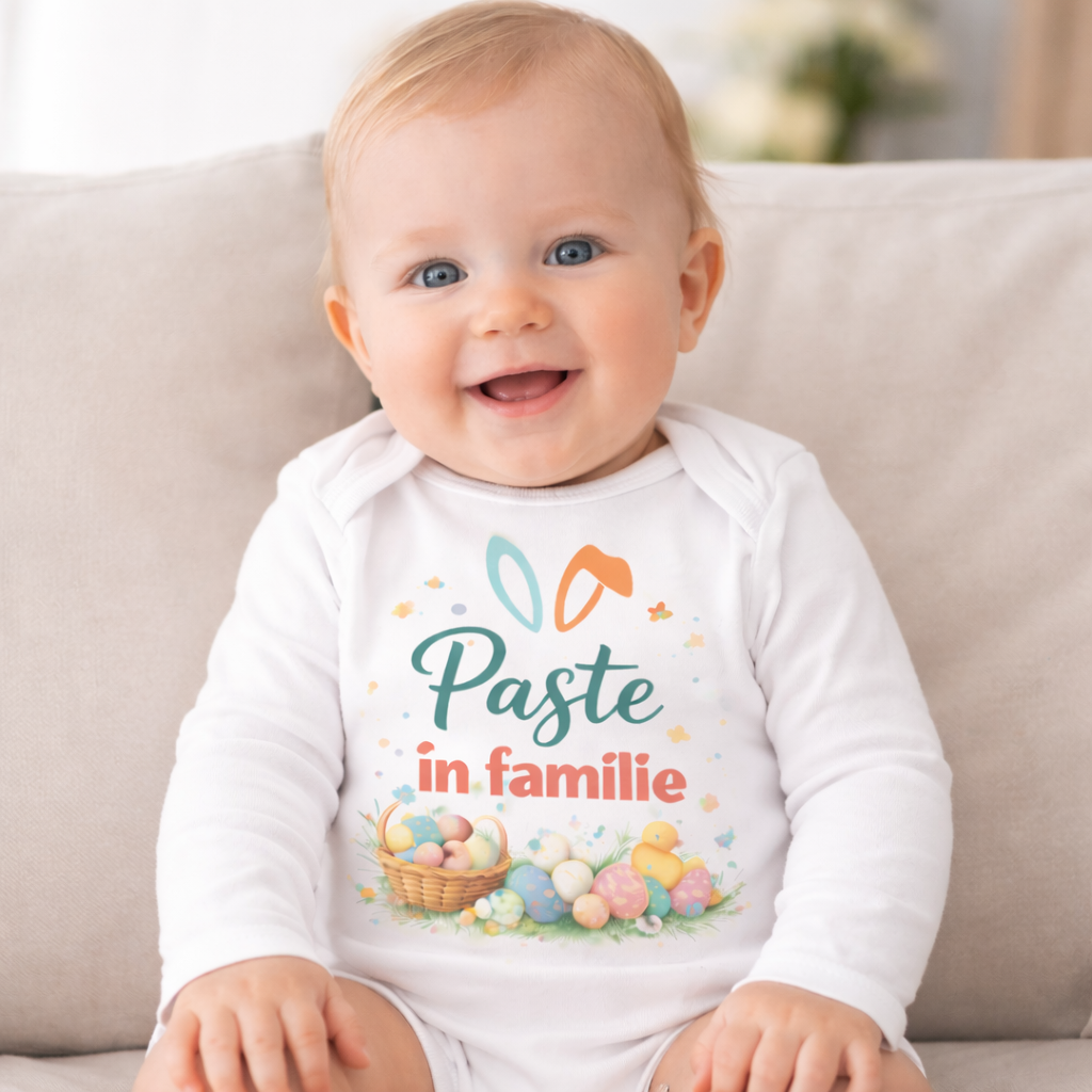 Acest design este disponibil in marimi pentru toata familia – de la body pentru bebelusi, tricouri pentru copii, pana la tricouri pentru adulti – astfel incat intreaga familie sa poata purta aceeasi tema de Paste.