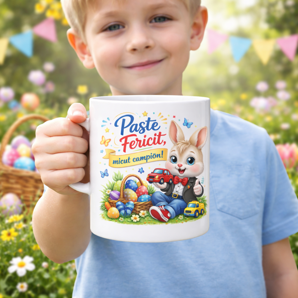 Designul vesel cu iepuras simpatic imbracat elegant, masinuta si oua colorate aduce zambetul instant si creeaza o experienta placuta pentru copil. Mesajul „Paste Fericit, micut campion!” completeaza perfect un cadou reusit.