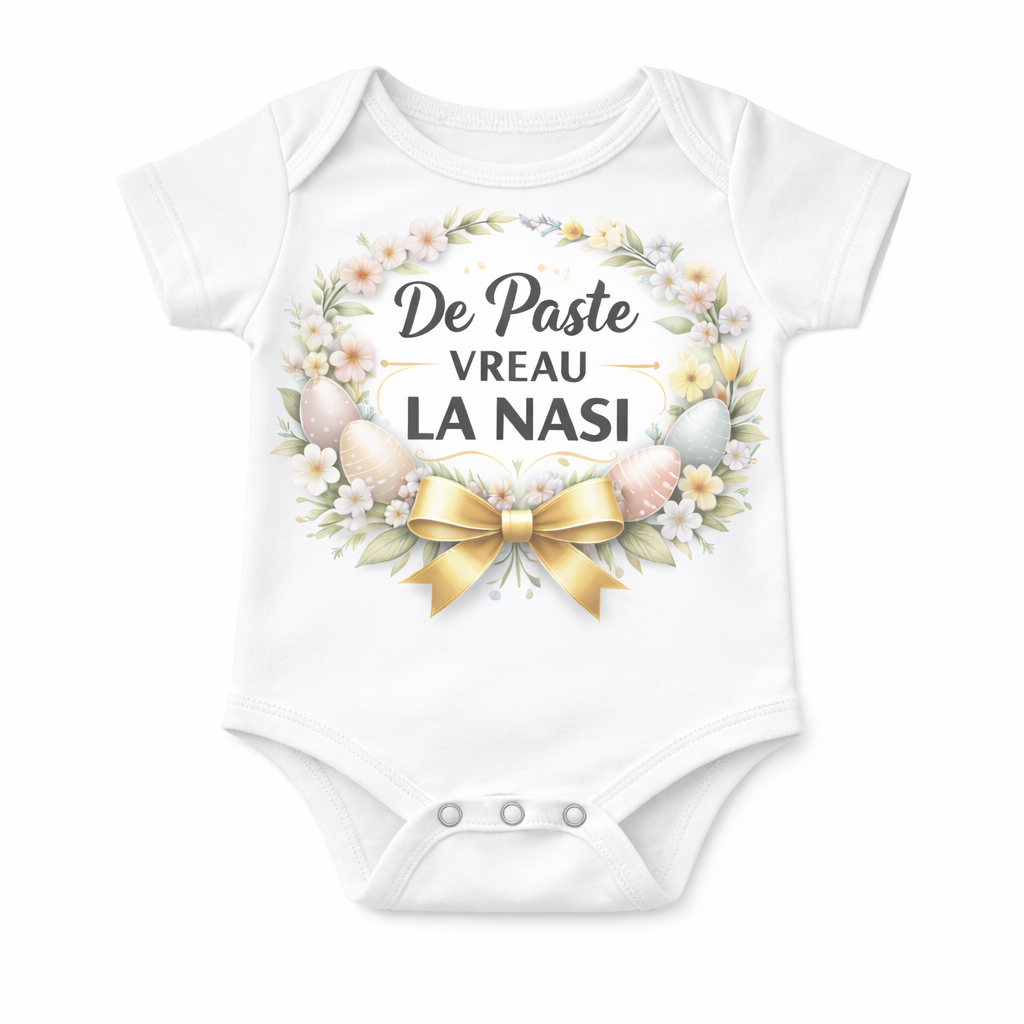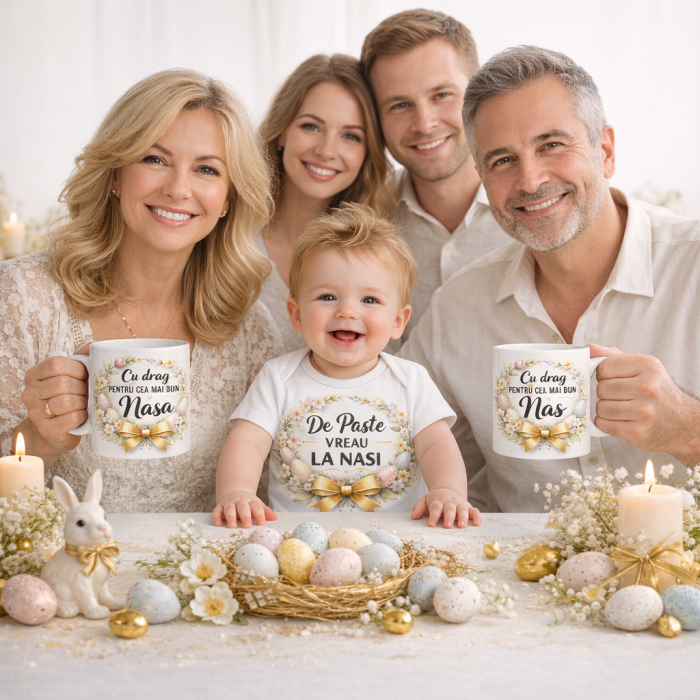 Acest set cadou special pentru nasi este modul perfect prin care finutul le poate transmite cat de mult inseamna pentru el. Body-ul bebelusului, cu mesajul adorabil „De Paste Vreau la Nasi”, impreuna cu cele doua cani personalizate pentru nasa si nas, transforma fiecare dimineata de sarbatoare intr-un moment plin de emotie.