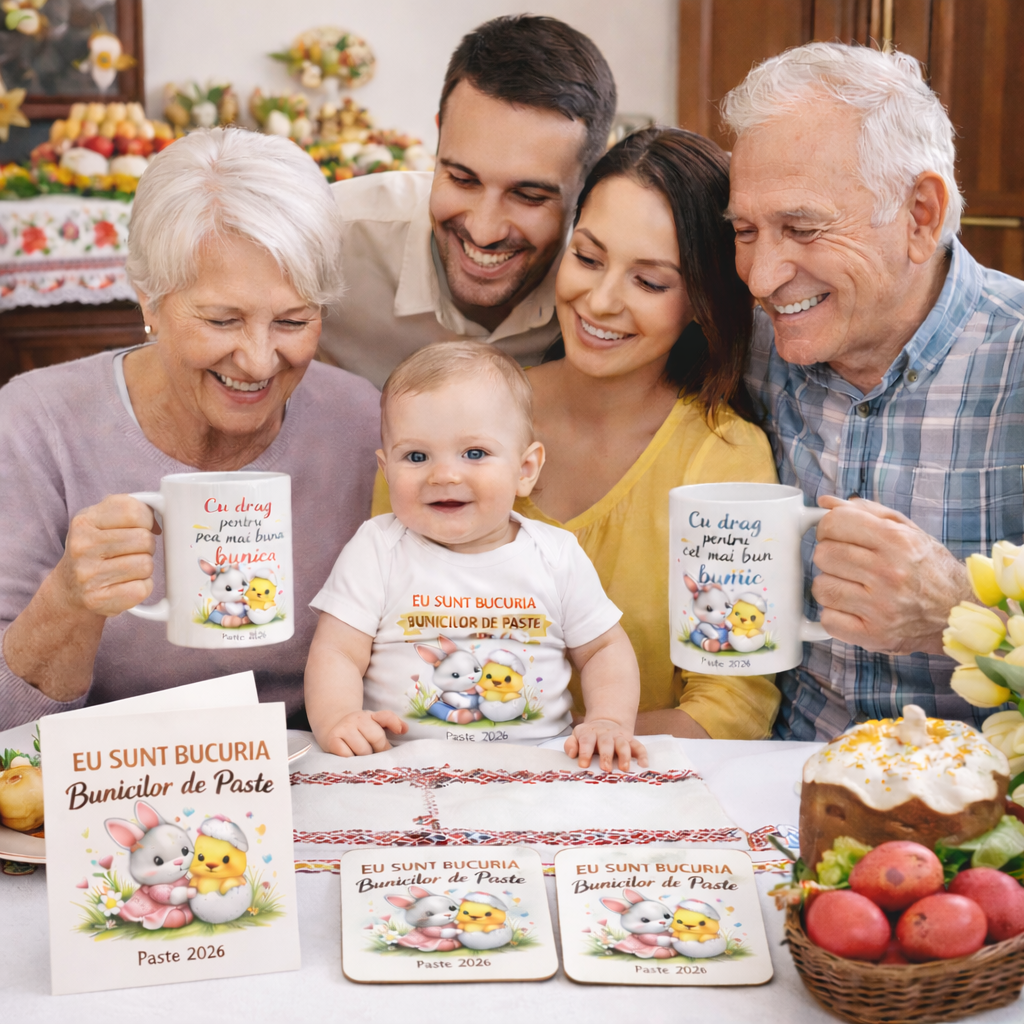 Set Cadou Paste Premium pentru Bunici 2026 – 2 Cani Personalizate, 2 Coastere, Body Bebe si Felicitare – “Eu Sunt Bucuria Bunicilor de Paste”