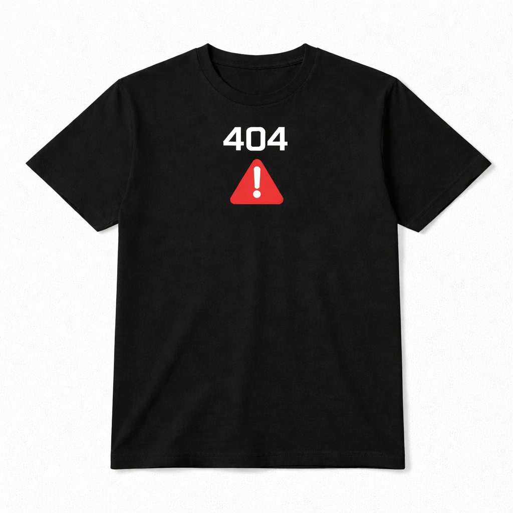 Designul minimalist, amplasat discret in partea superioara a tricoului, combina cifra 404 cu simbolul de avertizare, realizand un contrast vizual puternic intre alb, rosu si fundalul negru. Lipsa oricarui text suplimentar pastreaza tricoul curat, modern si usor de integrat in tinute diverse.